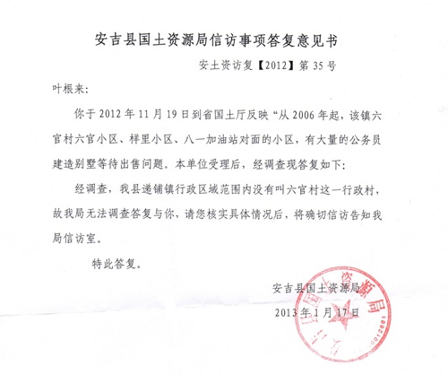 六官村现在改称“安乐社区”(刚改名不久),但几百年来这里一直叫六官村,而且举报材料上清清楚楚地写明它的方位是城北开发总公司西面30余米处,只要是安吉县城(递铺镇)的人,谁都知道六官村,安吉县国土局竟拿六官村过去的叫法与现在的叫法不一致来搪塞,这不是他们犯了常识性的错误,而是为了包庇那些造别墅的官员。2012年10月,叶根来等向湖州市国土局提出关于对安吉县国土局《信访事项答复意见书》的复查申请,但湖州市国土局却以“目前正处于调查取证阶段”为由中止办理复查申请。事情过去已近半年,“调查取证”却没有任何结果。就这样,上面推到下面,下面却以种种借口,不是“无法调查”,就是“中止办理”,这就使得农民举报难于上青天。