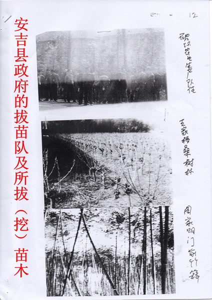 《安吉城市总体规划》给安吉老百姓带来的却是灾难。2002年,《南方周末》曾报道过《安吉县“城市化”真相》一文,当时记者经过10余天的暗访,跑了16个村庄,统计出安吉县的征地约在1万亩左右,而这1万亩土地征用时,90%没有任何批文;后来补办了近3000亩的征地指标,仍有7000亩属于非法征地。《南方周末》这篇报道发表后,安吉县政府采取的措施是抢购这份报纸,而不是反省自己的错误。2004年,更弄出这么一个劳民伤财的规划。根据这个规划,安吉县递铺镇、孝丰镇、梅溪镇等位于苕溪谷地几个镇大片耕地被毁,大量民房被夷为平地,村居被整体搬迁。农民世世代代安葬在山脚地的祖坟被刨,农民辛辛苦苦种在地里的庄稼和种在山里的树木和竹子被拔掉、砍掉。从2004年开始,安吉县政府不准农民在自己承包的土地上种东西,每年上百次派人到农民的土地上去拔苗木。农民是靠种地生活的,但安吉县政府宁肯让土地荒芜,就是不让农民去种。递铺镇荷花塘村村民叶根来种了5200多株桑树和30000多株生态林(淡竹),被政府组织的拔苗队拔得一干二净,而且屡种屡拔。为了强迫农民整体搬迁,安吉县政府不准农民缮修自家的房屋,不准农民在房前屋后搭建晒场、猪棚、鸡窝等附属设施。叶根来在自家原来的老房子上加了个屋顶,被城市行政执法局扒平,并将他水泥砖、瓦片等建筑材料砸得稀巴烂。荷花塘村另一姓董的农民因不肯整体搬迁,城管用挖土机将他家的晒场挖掉,将猪棚推平。村居被整体搬迁后,农民几代人的血汗被政府毁于一旦,新宅建成后更无法发展农业生产。八年多过去了,农民没有任何经济来源,几乎陷入绝境。但是,贪官污吏和工程包头却大发横财,甚至连村干部也从中捞饱,如荷花塘村,村干部每年都由开发区发工资及奖金,而且连村官的父母都能在开发区领工资。