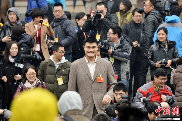 - 3月12日上午,全国政协十二届一次会议在北京人民大会堂闭幕。图为姚明突出记者包围后露出“囧”态。