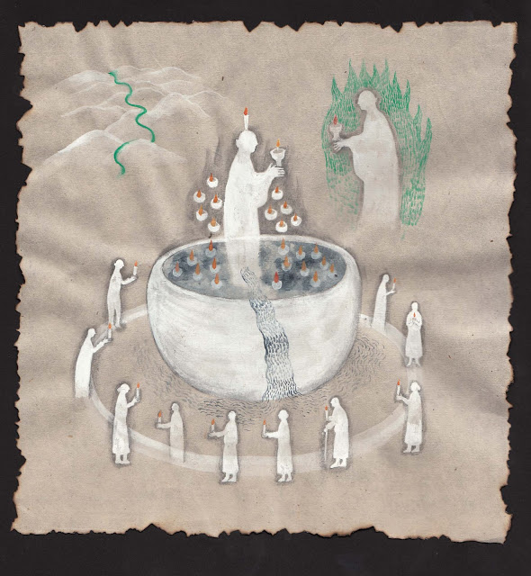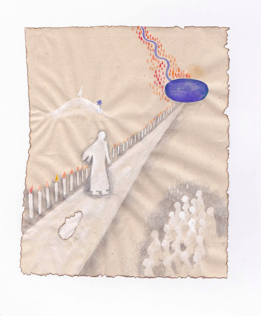 从喜马拉雅山麓那边传来一个个博巴以身浴火的消息。井早智代与众多的流亡博巴一起,在达兰萨拉的夜里秉烛悼念火焰中的牺牲者。2012年5月27日,在拉萨大昭寺与八廓街派出所之间,年轻的托杰才旦(Dobgye Tseten)和达吉(Dargye)自焚,由此开始,井早智代用画笔记录焚身的博巴,到现在已画有六七十幅之多。
