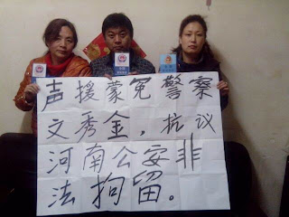 当蒙冤三警察黄玲、马治国、刑警之妻徐兆杰得知这个消息之后,便产生了同情之心,因为相同的职业与相似的遭遇使三人同仇敌忾,于是三人便在住所举牌声援文秀金,并抗议河南新乡公安对蒙冤警察文秀金的非法拘留。