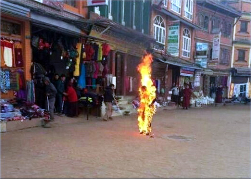 2月13日,在尼泊尔首都加德满都市中心,一位25岁的博巴(藏人)——竹钦泽仁(Drupchen Tsering)以抗议中国对他的祖国的统治。得知这个消息时,我禁不住想象烈焰裹身的他就像在达莫鲁津山上被饿虎包围的佛陀。佛陀用自己的身体去拯救群虎,而竹钦泽仁将自己置于压迫者的利爪之下,用自己脆弱的血肉之躯磨平北京政府的尖牙利齿,从而使他人或能因此幸免于难。如果那位王子是一位生在今天的博巴,看到他的人民、他的国家和他的文化受到一个残暴帝国的鲸吞,他会怎么做呢?