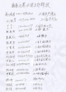 (维权网信息员孙小芸报道)3月22日下午,上海维权人士顾永洪、郑培培、刘桂芳、吉吉、张燕红、陈建芳、丁菊英、申琴芳、刘淑珍、周菊仙、孙洪琴、陈桂荣、张翠珠、徐小妹、陆雅美、颜兰英等人带着55位维权人士(详见捐款签名单)为反腐维权被逮捕的魏勤捐款人民币1150元(附:捐款清单)赶到上海市静安区看守所,准备打在魏勤的账户上。看守所大门紧闭,大家就在大门外为魏勤打横幅声援:“ 魏勤无罪立即释放”、“反腐英雄魏勤无罪必须立即释放”。并朝看守所内高喊:“魏勤无罪”、“魏勤冤枉”、“立即释放”等口号,以此强烈抗议当局对魏勤的迫害。