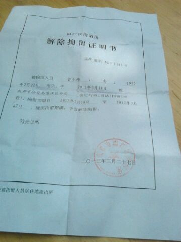 (维权网信息员琳娜报道)2013年3月27日上午10点左右,因上访被温江当局以“扰乱社会秩序”拘留8日的温江实地农民曾少梅,拘留期满走出了拘留所,成都维权人士陈云飞、李廷惠、王蓉文等20余人前往迎接英雄的曾少梅。