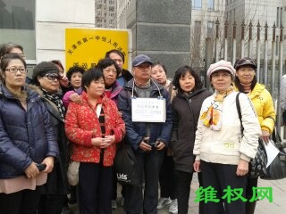 (维权网信息员唐韵报道)3月29日下午2点,震惊全国的天津市北辰区辛庄因选举引发的血案,在天津市第一中级法院公开开庭审理。(以下简称天津一中院)。数十名关注此案的人士前往旁听被强行阻止,引起众人的抗议。