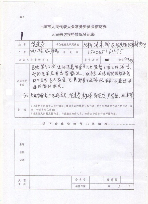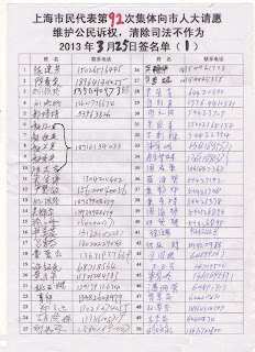 (维权网信息员雷鸣报道)3月25日星期一下午2时,上海74名市民为了捍卫法律尊严,第92次代表上海1060户被上海三级法院剥夺诉权的家庭请求上海市人大常委会履行法定职责,追究三级法院剥夺公民诉权的违法行为。在征地、拆迁、拘留、劳教、医疗事故、劳动争议、司法不公等案件中,上海三级法院不作为,对当事人依法提起的诉讼既不立案、又不裁定。法院的法官不讲法,恶意剥夺公民应有的诉权,人大应当监督查处,应该追究渎职侵权的法官责任和法官的腐败行为,彻底清除上海三级法院有法不依的恶习,铲除一切腐败根源。