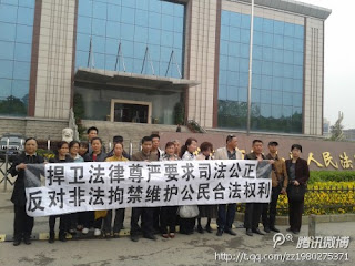 在庭外的维权人士拉起了“捍卫法律尊严要求司法公正、反对非法拘禁维护公民合法权利”的横幅,引来了众多的路人前来旁观。
