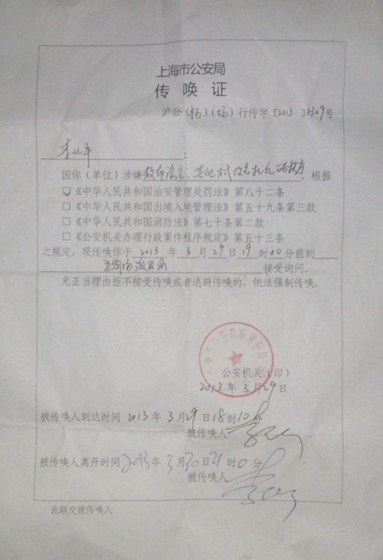 李化平告诉信息员:“在一个月中被7次传唤,其中五次传唤时间分别达24小时,2次各8小时。3月22号我太太被同济大学解聘,警方还对住在我家里的侄子进行威吓,扣留他的电脑!另一个方面,他们通过对我个人污黑,同时分化我们的朋友们。每次传唤,总是二十四小时,3月29号开始的传唤关押则到了29小时,在里面不允许我看书,不准保安给我吸烟,无非就是想通过这样的方式击跨我”。