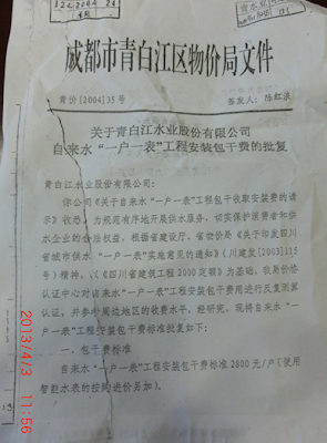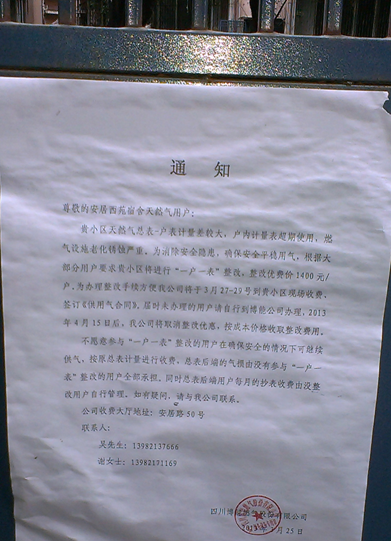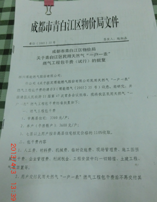 (维权网信息员陈敏报道)去年以来,成都市青白江区天然气公司与自来水公司以管道有跑、冒、滴、漏为由,逐步对管道进行了一户一表改造。但在改造过程中,对每个用户收取2千至3千多不等的改造费,如不改造就采取分段供水甚至断水断气以及其他歧视性政策,致许多低收入家庭陷入窘境,甚至无力支付。而天然气公司与自来水公司收费的依据是青白江物价局青价字﹙2005﹚35号、﹙2004﹚35号、﹙2010﹚30号、﹙2011﹚142号文及批复。费用包括人工费、材料费、机械费、临时设施费、现场管理费、施工图预算包干费、企业管理费、利润税金、工程安装中的城市道路占道费、绿化赔偿费、交通管辖道路占道开挖费及恢复费等一切赔偿费,土建工程气表装置等费用。