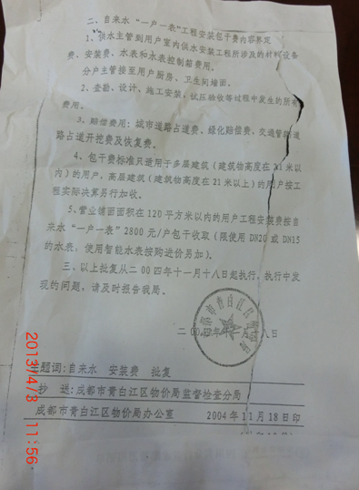 2004年11月18日,被申请人下发了《成都市青白江区物价局青价字﹙2004﹚35号、2005年下发了青价﹙2005﹚35号文件》2010年 9月 10 日,被申请人下发了《成都市青白江区物价局青价﹙2010﹚30号文件》批复、。上述文件要求成都市青白江区天然气公司、青白江自来水公司(以下简称“区天然气公司”“区自来水公司”)的用户即行政复议申请人,在“区天然气公司”“自来水公司” 进行管道改造过程中,必须缴纳2千至3千多不等的改造费。否则,“总表后端的气损由没有参与一户一表整改的用户全部承担,同时总表后端用户每月的抄表收费由没有整改用户自行承担”,或者“分段送水、甚至断水断气” 。