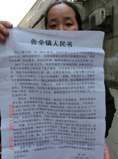 (维权网信息员陈华报道)四川省三台县景福镇蜜蜂嘴村五组的陈小青,2013年4月3日,向派出所递交到北京旅游的告知书后,于4月8日与吴吉伟、龙保军、赵德玉、冯中富、邓前银、羊衍伦、肖方礼、刘志琼、林俊生、唐有合、曾怀宪、羊衍全、左王庆、邓前银等15人,乘坐火车到北京旅游。