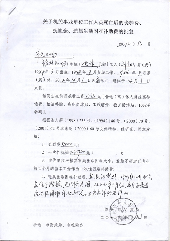 1、临安市人事局《关于机关事业单位工作人员死亡后的丧葬费、