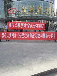 4月12日上午9点,在武汉光谷,广州民主人士孙德胜和袁奉初,联手武汉民主人士李勇、童斌拉横幅向市民宣传,横幅上写着:“敦促人大批准《公民权利和政治权利国际公约》”、“武汉公民要求官员公布财产”。摄像师李勇霖在旁用镜头记载了这一行动。