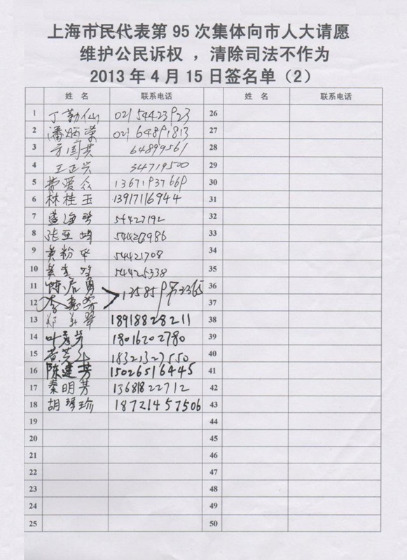 上海市民向市人大已经95次请愿“我要立案——维护公民诉权”行动,仍然没有丝毫进展。大家认为,上一届人大领导对公民要求立案的诉求装聋作哑、视而不见,故意拖延忽悠民众的诉求,为腐败恶势力保驾护航,没有依法履行自己的行政职权。