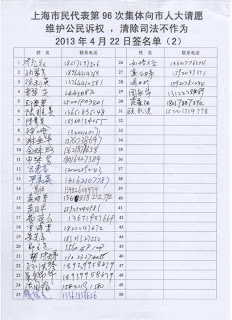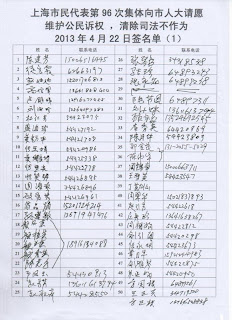 (维权网信息员雷鸣报道)4月22日星期一下午2时,上海市民为了捍卫法律尊严,维护公民诉权,坚持向市人大常委会请愿。81名上海市民参与 “我要立案——维护公民诉权”行动,第96次代表上海1060户被上海三级法院剥夺诉权的家庭,向市人大常委会请愿:要求市人大履行法定职责,监督上海三级法院司法不作为。当事人对地方各级政府违法行政不服,依法诉至法院。一审法院应在7日内立案受理、或作出不予受理的裁定。一审法院知法违法,既不立案也不裁定。当事人依法诉至中院、高院,同样违法不不立案也不裁定。藐视法律,恶意剥夺公民应有的诉权。当事人已96次要求市人大彻底清除上海市行政管辖区内的一切司法不作为,乱作为的恶习,要求彻底铲除一切腐败行为,维护公民的合法权利。