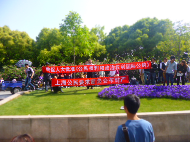 (维权网信息员冬雷、余醒报道)今天(2013年5月2日)本网信息员获悉,广东维权人士孙德胜、徐琳等人于昨天下午在上海人民公园前与上海市政府前举牌呼吁官员公布财产及要求人大签署《公民权利和政治权利国际公约》。