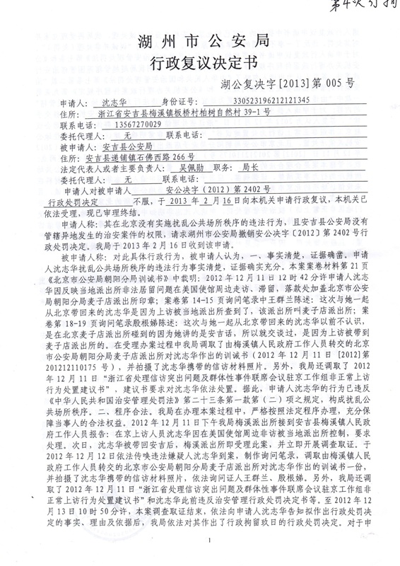 (维权网信息员钱江报道)浙江省安吉县维权人士沈志华从去年5月以来,因上访被当局非法拘留四次,每次拘留后,她都要申请行政复议,然后起诉、上诉。虽然结果早已预料,但依法行使公民申诉的权利,对国家的法制建设,推进我国的法治,是很有必要的。经过前几次的复议和诉讼,湖州市公安局理屈词穷,现在竟弄出个“浙江省处理信访突出问题及群体性事件联席会议驻京工作非正常上访行为处罚建议书”这样一个文件作为法律依据,令人啼笑皆非。须知这个“浙江省处理信访突出问题及群体性事件联席会议驻京工作非正常上访行为处罚建议书”本身就是违法的,这跟文化大革命中的红头文件没有什么两样。以非法文件来证明违法行为当然只能是非法的。
