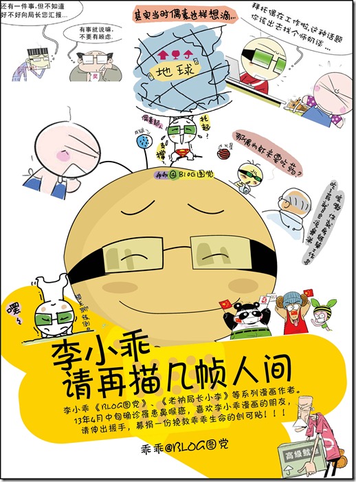 4月28日,有网友爆料称知名漫画家李小乖罹患鼻咽癌,正在南京诊治。消息传播后,许多网友表示了关注并呼吁为其捐款,李小乖在众人问候声中发布了两则消息,称自己病情“尚不太晚”、“定会归来”,感谢之余不忘作画调侃。数字时代曾多次收录李小乖“blog图党”的内容,其画作风格轻松、内容犀利,编辑在此对他予以问候,希望他能平安归来,继续作画。