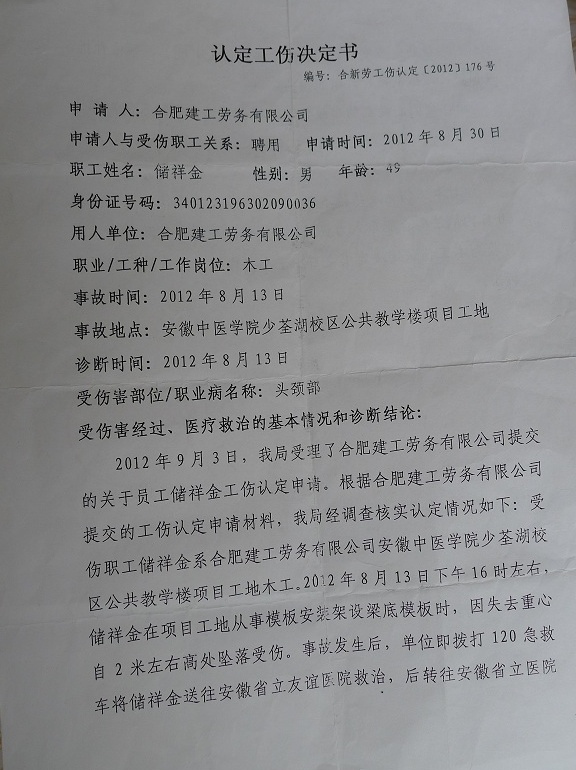 据悉,今年五十岁的储祥金是一名木工,他于2012年8月13日在合肥建工集团的安徽中医学院工地工作中不慎从2米左右高处坠地受伤,经送安徽省力友谊医院诊治,及转安徽省立医院治疗,目前病情稳定,成颈椎截瘫病人。2012年9月3日,用人单位合肥建工劳务有限公司向合肥市劳动部门申请工伤认定,同月20日,合肥市劳动部门以合新劳工伤认定[2012]176号《工伤认定书》认定储祥金属于工伤。其后,储祥金继续在省立医院治疗,伤情稳定后转为康复治疗。住院期间,由家人在医院照顾。住院迄今已经长达八个多月,用人单位仅仅支付了两万余元的生活费,引起储祥金及家人的不满,储祥金与家人非常焦虑,深恐未来生活怎么办?储祥金是木工,在建筑工地上是最赚钱的工种,工作一天的收入200元,足以养家,还能支持年纪七十多岁的父母,如今因工伤致残,不仅需要家人照顾,更无法打工挣钱,可八个多月用人单位仅支付两万余元的情形令他们非常担忧和焦虑,急于找用人单位要工伤补偿费。而用人单位的工作人员则要为储祥金的工伤认定、伤残等级鉴定,康复确认、护理依赖等级鉴定等联系劳动部门,又因为不熟悉办理工伤保险规定而头痛不已,更要面对储祥金家人因焦虑而对用人单位的误解争吵不休。