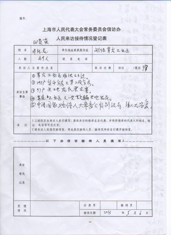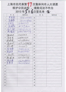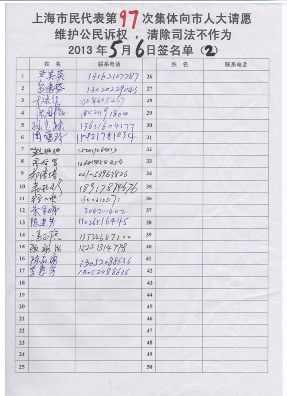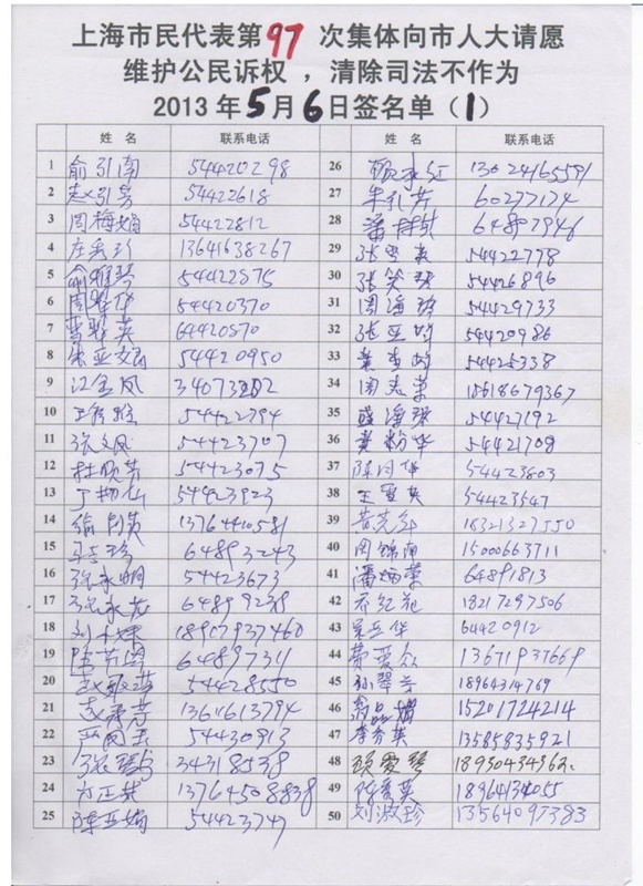(维权网信息员孙小芸报道)5月6日星期一下午2时,上海67名市民为了捍卫法律尊严,维护公民诉权,第97次代表上海1060户被上海三级法院剥夺诉权的家庭,向市人大常委会请愿:要求市人大履行法定职责,监督上海三级法院司法不作为。当事人对地方各级政府违法行政不服,依法诉至法院。一审法院应在7日内立案受理、或作出不予受理的裁定。一审法院知法违法,既不立案也不裁定。当事人依法诉至中院、高院,同样违法不不立案也不裁定。藐视法律,恶意剥夺公民应有的诉权。当事人已97次要求市人大彻底清除上海市行政管辖区内的一切司法不作为的恶习,要求彻底铲除一切渎职侵权的违法犯罪行为,维护公民的合法权利。