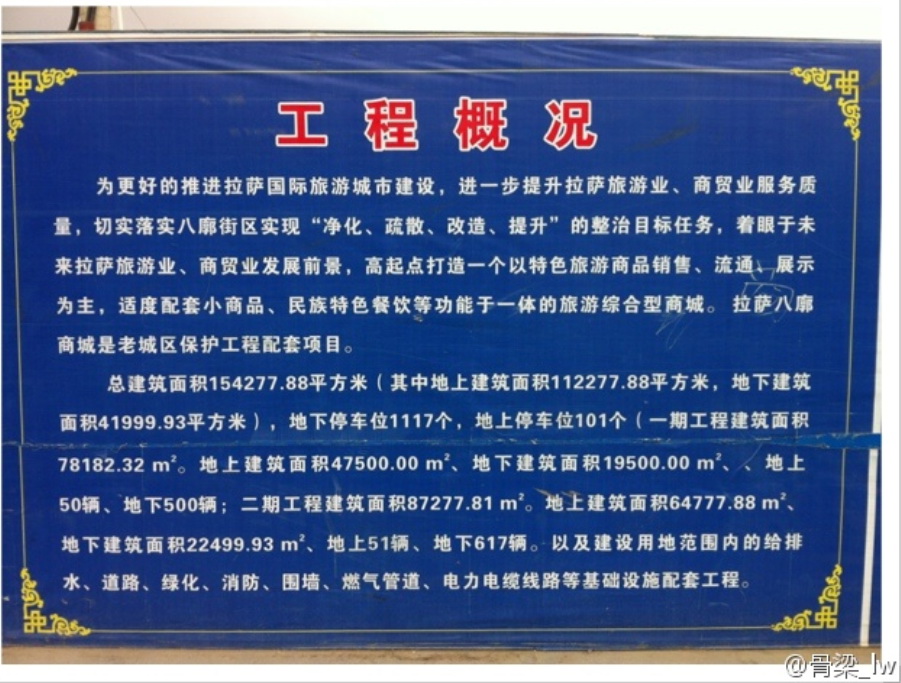 受到質疑的開發計劃是一個正在拉薩老城區建設的名為“八廓商城”的購物中心。開發商說,這個購物中心一旦建成,將占地15萬平方米并擁有超過1000個停車位。