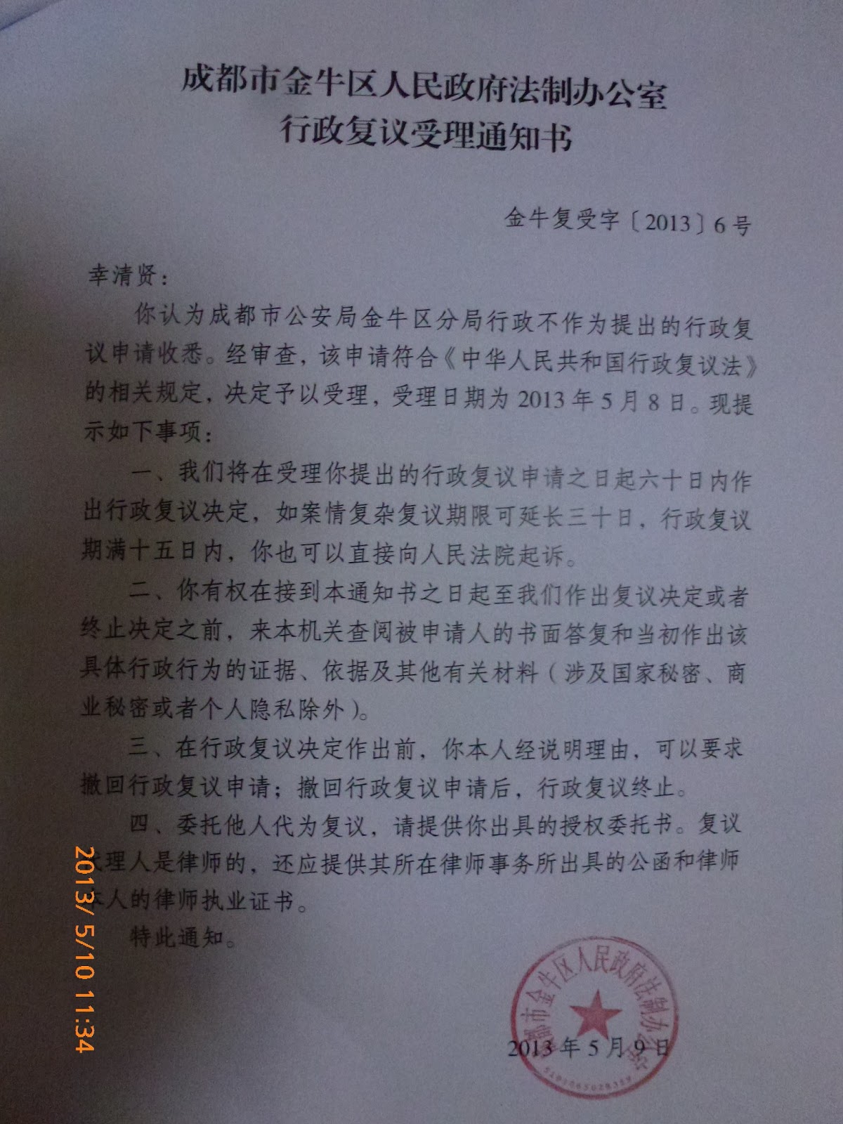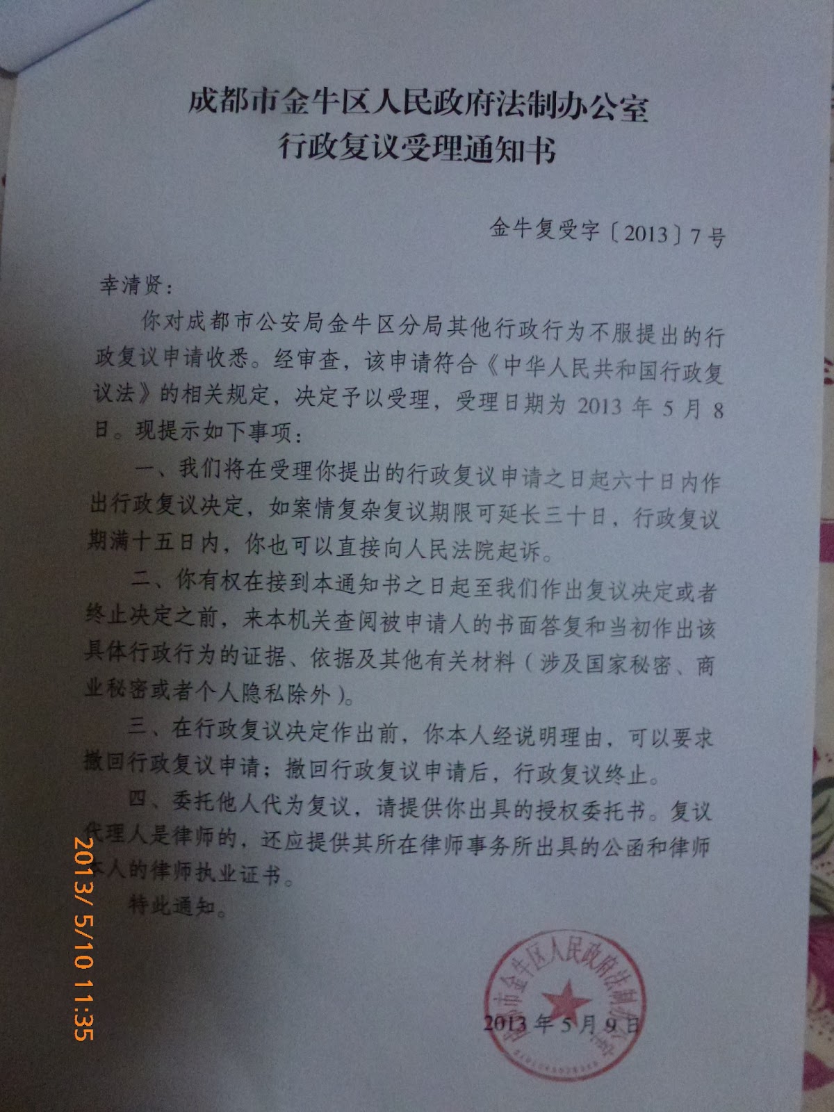 (维权网信息员林立报道)2013年5月4日、5月5日,幸清贤连续两天被非法限制人身自由,手机被抢删除了相关视频图片证据,一怒之下,幸清贤依法向金牛区人民政府提起了两起行政复议,一份是要求确认金牛公安在2013年5月4日对幸清贤被不明身份人员限制自由并发生抓扯的行政案件中不作为。一份是要求确认金牛公安在2013年5月4日限制幸清贤人身自由“口头传唤”行为违法。和确认被申请人在在2013年5月4日抢走幸清贤手机并删除手机内的视频证据行为违法。