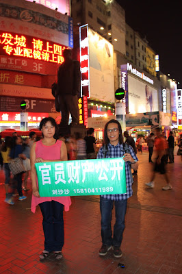 前几日,刘沙沙和香港保钓船长杨匡一起在长沙黄兴路上,拉横幅“官员公布财产”,声援北京和江西因要求官员公布财产而被关押的公民们。