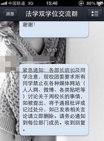 墙外楼 | 南昌大学紧急通知 2013年5月11日 原文 南昌大学紧急通知要求删除关于校长#周文斌#各种舆论。附内容:各部长班长及同学注意,现校团委要求所有同学禁止在各种媒体网站(人人网、微博等)讨论关于周校长的事情,如查出,将予通报批评或记过处分,如已发表立即删除! 【南昌大学校长周文斌涉嫌严重违纪接受调查】记者10日从江西省纪委获悉,南昌大学党委副书记、校长周文斌涉嫌严重违纪,目前正在接受组织调查。据了解,9日下午周文斌被江西省纪委工作人员带离办公室。 本文由自动聚合程序取自网络,内容和观点不代表数字时代立场 墙外新闻实时更新 欢迎订阅数字时代 所在分类:参考消息,网事纷呈标签:转载,时政,推荐网文 相关文章 【图说天朝】你们认为这世界上最终极的邪恶是什么? 新浪新闻 | 知名色情网站草榴社区4名骨干成员落网 BBC | 中共十九大前媒体监管:“盛世”景象 如谁愿? 中青报 | 四大门户网站“标题党”被网信办通报批评 宋石男:再见 石无忌惮
