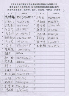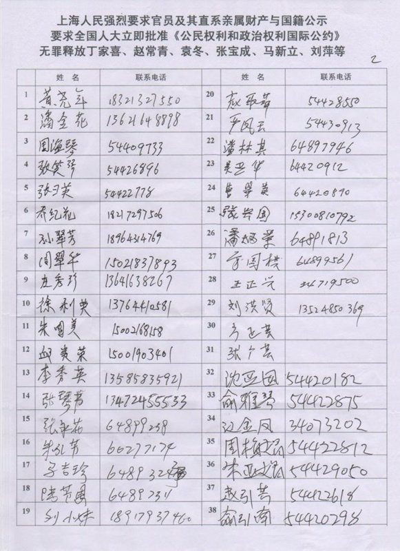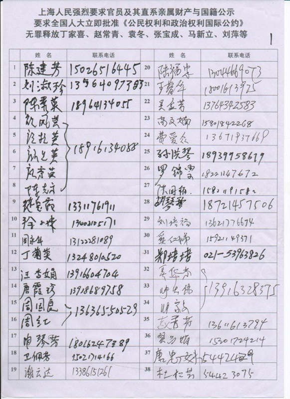 (维权网信息员孙小芸报道)5月13日,上海维权人士陈建芳、刘淑珍、陈秀英、陈志方、徐小妹、丁菊英、申琴芳、高文婻、王蓉华、周国良、谢云达、陆福忠、孙洪琴、胡琴珍、奚仁娣、郑培培、黄尧年、乔纪花、周翠华、邱贵荣、方林娟、童莉雅、费爱众、周锦南等100多人签名(详见签名单,若有重复签名,敬请谅解)要求无罪释放丁家喜、赵常青、袁冬、张宝成、马新立、刘萍等“要求官员财产公开”被抓捕的律师和维权人士。