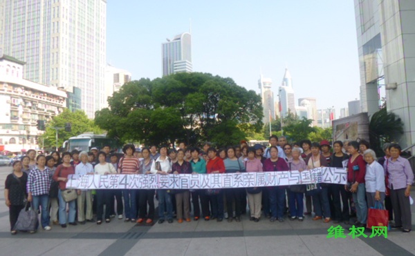 上海人民依仗《宪法》第二条赋予的权利:中华人民共和国一切的权力属于人民。大家一起到人民广场拉出横幅:《上海人民第4次强烈要求官员及其直系亲属财产与国籍公示》,为丁家喜、赵常青、袁冬、张宝成、马新立、刘萍、孙含会、王永红、李蔚、齐月英、魏忠平、李学梅、邹桂琴、李思华等人声援,并为所有践行公民权利的人们呐喊《上海民众强烈要求全国人大立即批准公民权利和政治权利国际公约》。