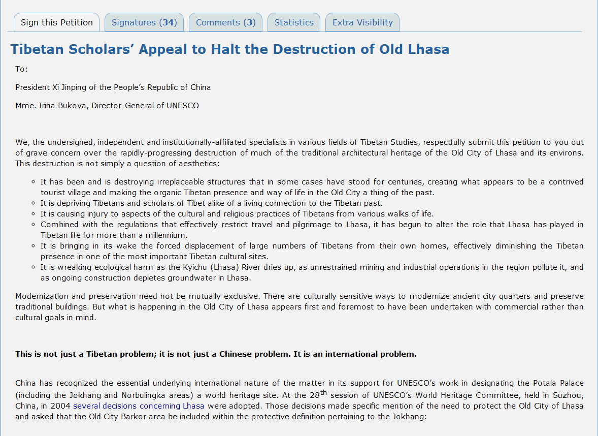 We, the undersigned, independent and institutionally-affiliated specialists in various fields of Tibetan Studies, respectfully submit this petition to you out of grave concern over the rapidly-progressing destruction of much of the traditional architectural heritage of the Old City of Lhasa and its environs. This destruction is not simply a question of aesthetics: