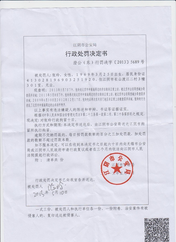 据无锡市一位知情人 沈 先生透露:今年5月6日,张玲又到北京上访,揭露江阴市公、检、法各级机关徇私枉法、钱权交易等违法行径。在5月7日、8日,两次被北京警察查获关马家楼。5月9日,被江阴市警方从马家楼强制带回当地并传唤。5月10日,张玲被江阴市公安局处以行政处罚拘留10日。