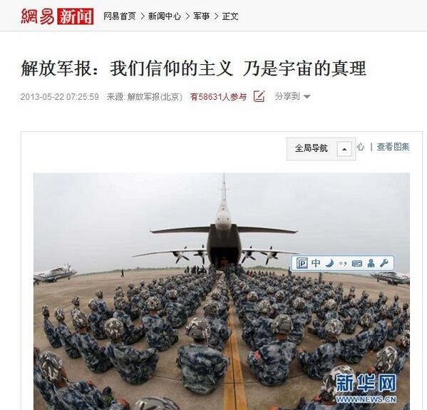 5月22日,解放军报发表评论文章《中国梦的自信在哪里》,文章提到“中国梦以信仰为魂、自觉为根”,面对复杂多变的国际环境、艰巨的国内改革任务、党所面临的严峻考验,我们仍要对中国梦充满自信,那是因为我们笃信“我们信仰的主义,乃是宇宙的真理”。这篇文章被各大门户网转载时,将标题修改为《我们信仰的主义 乃是宇宙的真理》,文章在受到大量转发的同时,也遭到网友犀利吐槽,许多网友都表示这种文风颇有向朝鲜看齐的架势。