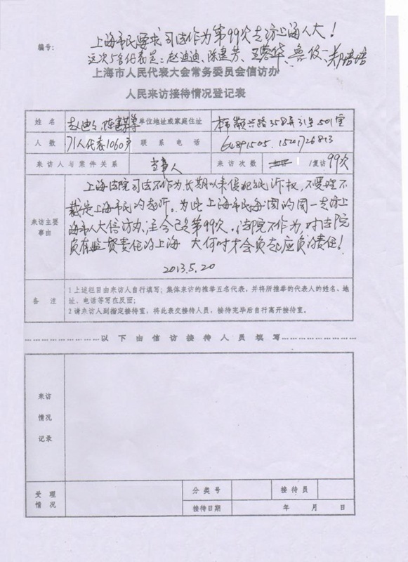 市民代表已经第99次要求市人大彻底清除上海市行政管辖区内的一切司法不作为、乱作为的恶习和腐败行为,维护公民的合法权利。