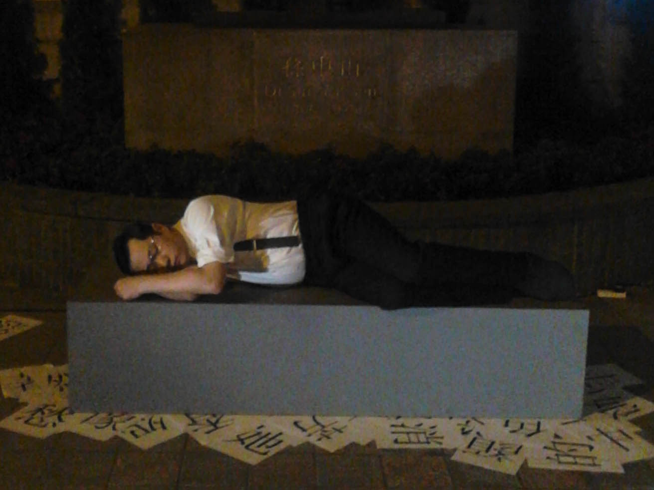 進場之時,大家齊集天井。我還跟朋友打趣說︰「這個保安,幹嘛睡在這裡呀?大肚腩都歪一邊去了。」偷拍了一張照片。音樂在夜幕中昇起,他緩慢地、耍太極似地、將醒未醒、離夢又入夢似地,半伏在台階上,印着和場境不怎麼相襯的新細明體的大字上,伸展着,起舞着,導人入迷。細看總覺得眼熟,想一想,那不是以前亞視的演員嗎?(亞視放心吧,你並不是沒有觀眾,十幾年前我還是有看你的。)證明香港的電視劇侷限了多少人的想像,一個演員在電視台十年,所做的角色可能只有一兩種,對白表情來來去去都那幾回。一旦離開,世界無限大,他的演技、水平,往往超乎我們所「認識」的那個他。