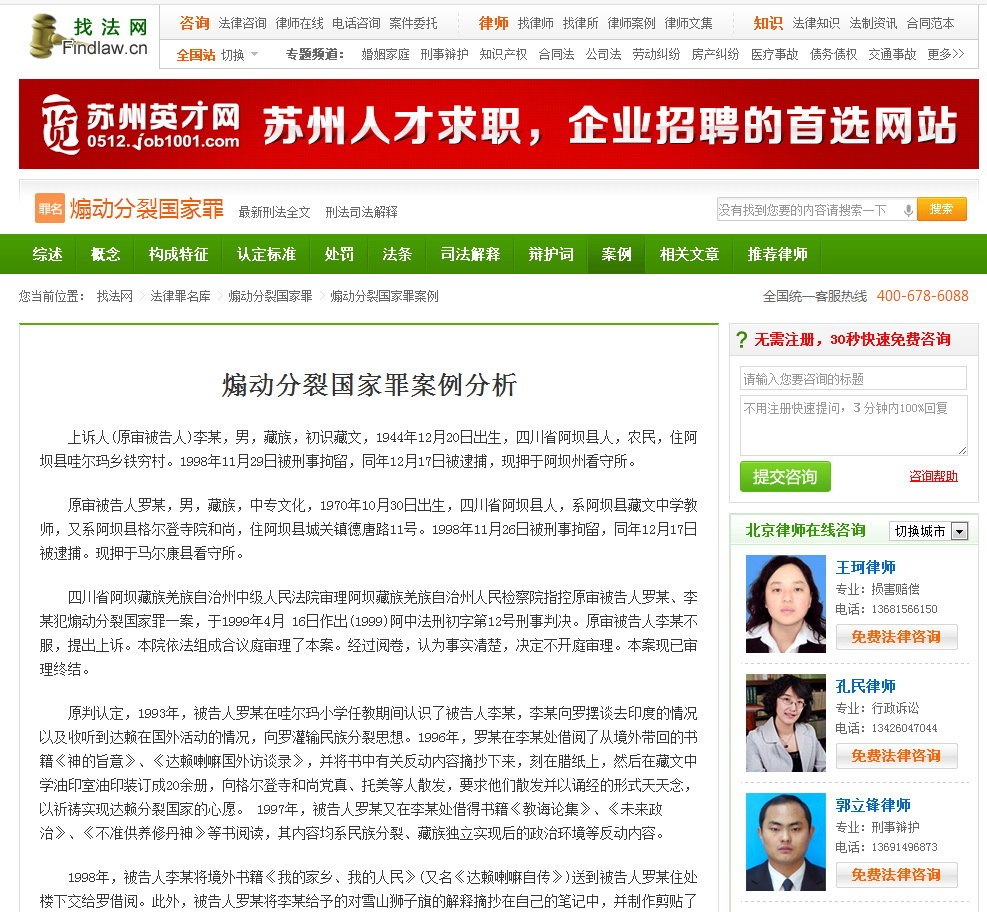 在网上找尊者达赖喇嘛的自传,不想找到了这篇《煽动分裂国家罪案例分析》,在找法网上。是1998年的事,两个阿坝藏人因传阅尊者传记等,被以“煽分”判刑5年和4年。奇文共欣赏,有必要转载。以上为该网页截图。