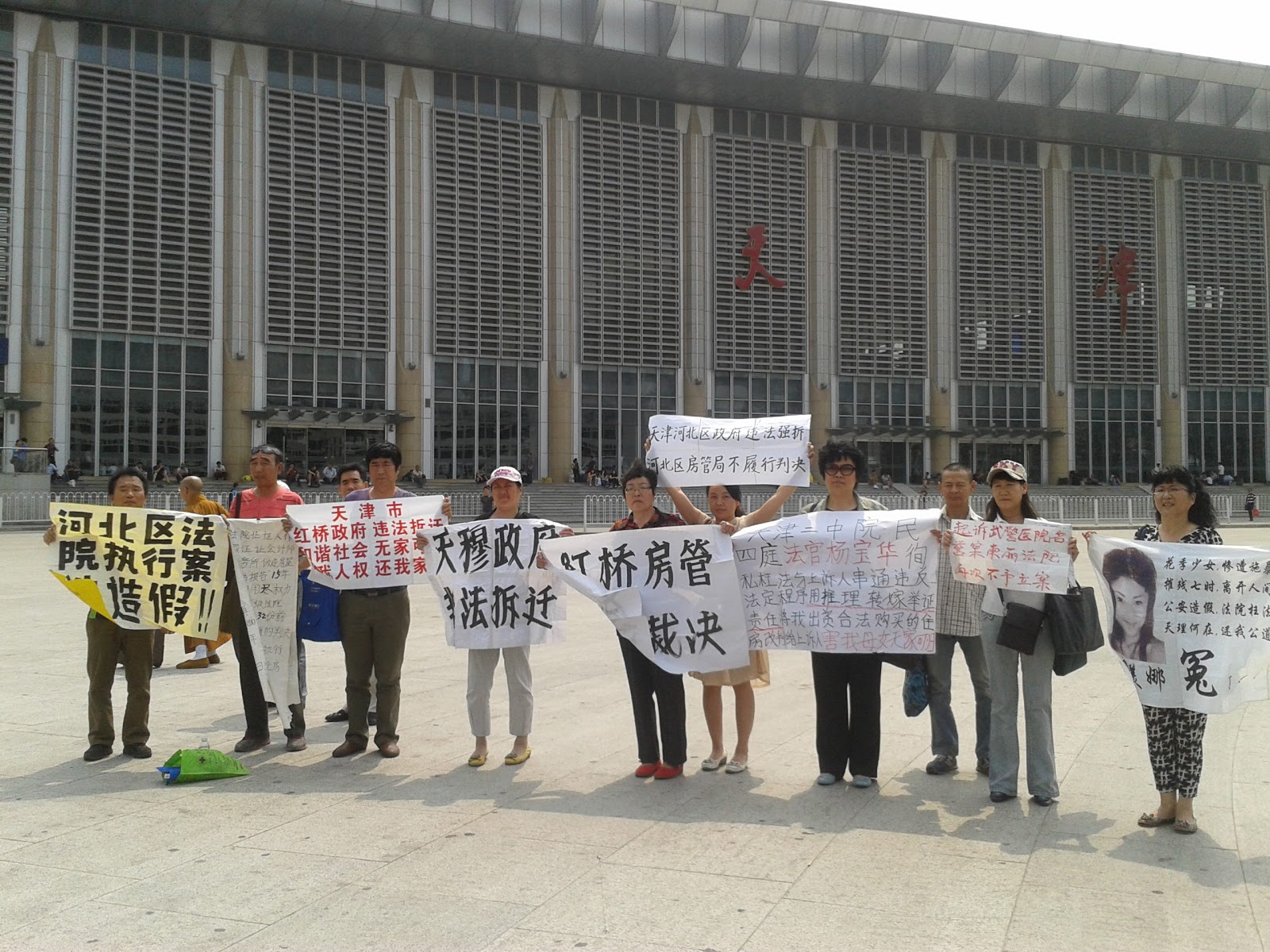 (维权网信息员苏媛报道)5月25日来自天津的维权访民自发的聚集一起,打出《抗议北京公安非法滥抓无辜,要求释放维权人士邓志波、何祖华等人》的标语,抗议北京警方刑拘邓志波、何祖华、赵广军、吕动力、张继新、王素娥等人。