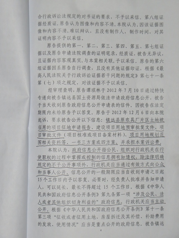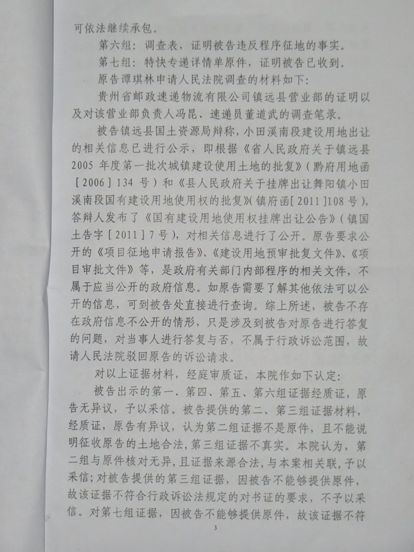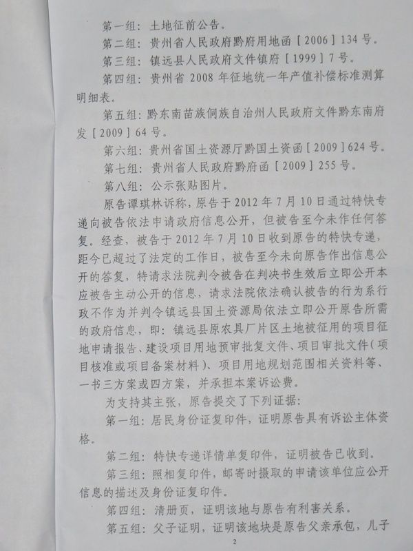 据了解:自从谭其林知道当地要征地后,于2012年7月10日通过特快专递的方式向镇远县国土局申请信息公开,要求公开镇远县原农具厂片区土地被征用的项目征地申请报告、建设项目用地预审批复文件、项目审批文件(项目核准或项目备案材料)、项目用地规划范围相关资料等一书三方案或四方案,但镇远国土局超过法定期限拒不向谭其林公开这些政府信息。