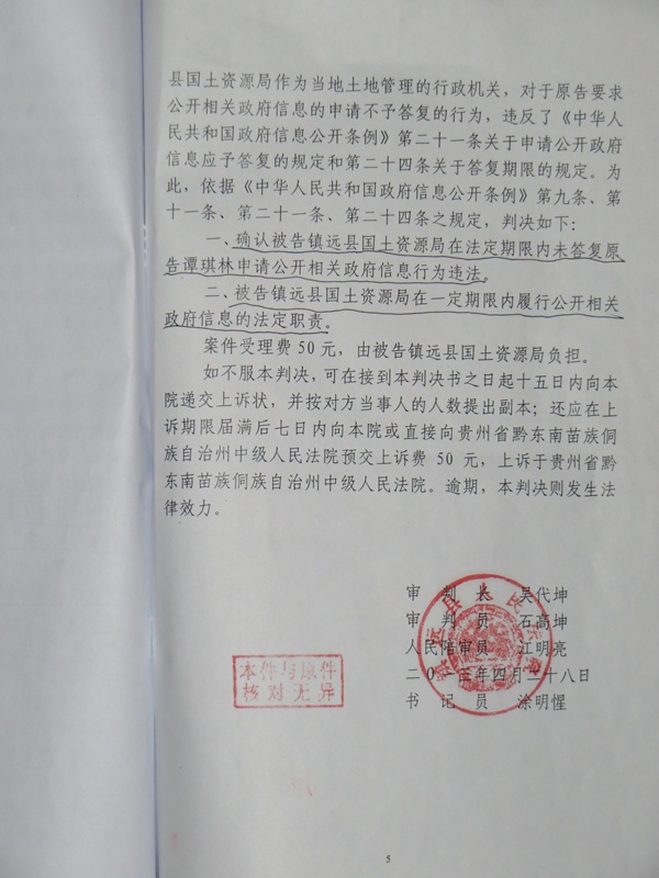 (维权网信息员李娜报道)4月28日,贵州农民谭其林终于拿到了镇远县法院的行政判决书,判决确认镇远县国土局拒不向谭其林公开有关征地的政府信息违法,并判令其向谭其林公开信息,然而,法定的15天上诉期早已超过,镇远县国土局至今没有向谭其林公开政府信息,也没有向上级法院提起上诉,目前,农民谭其林已经向镇远县法院申请“强制执行”。