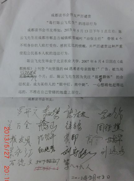成都读书会书友认为:陈云飞先生作为中华人民共和国公民,他有权在中华人民共和国的任何地方居住,殴打陈云飞先生是侵犯公民基本人权的违法行为。对此,书友们严厉谴责:成都市郫县古城镇邻城村治保主任带人殴打陈云飞先生的违法行为!并敦促:成都市郫县古城镇警方依法追究打人者的法律责任!
