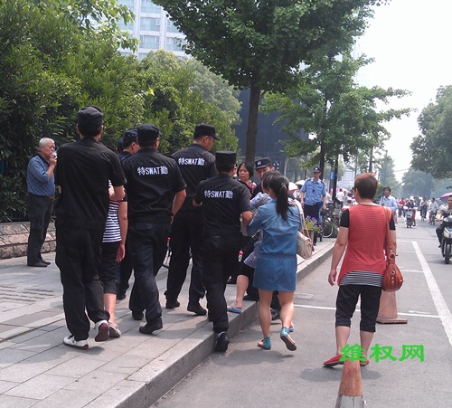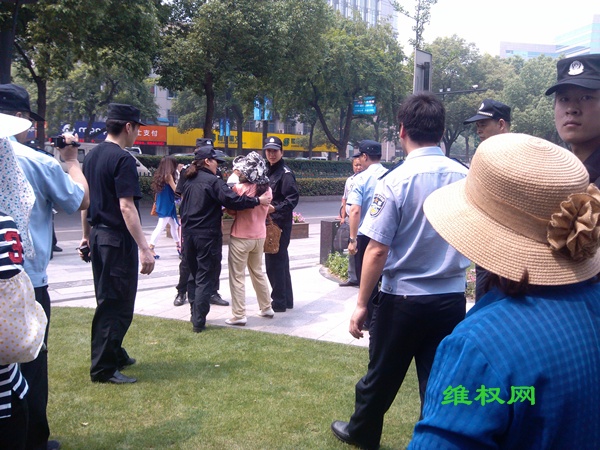 然而,今天(5月29日)的情况与以往不同。上午9点左右,当访民们从四面八方赶来时,市政府门前已布满警察和便衣,不准访民靠近,并将他们驱赶到附近的万向公园。浙江民主党人王富华是杭州木材厂职工,他带领该厂职工维权已有近十年历史,2005年曾因集体维权被拘留七天,后又将公安告上法庭。今天上午9点,他和本厂退休工人应志温等数十人来到市政府,结果被警察驱逐到万向公园。他看到警察在驱赶访民的过程中对访民动粗,便上前指责,结果被拉上警车送拱墅区巡特警大队关押起来。77岁的应志温看到王富华被抓便上前与警察论理,结果也被抓到拱墅区巡特警大队。杭州著名维权人士朱瑛娣、梁丽婉随后也被抓到拱墅区巡特警大队关押。除王富华、应志温、朱瑛娣、梁丽婉外,还有杨幸华、徐彩英、殷小翠、郭文娟等六、七人也被关到拱朝墅区巡特警大队。