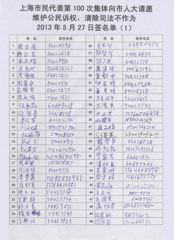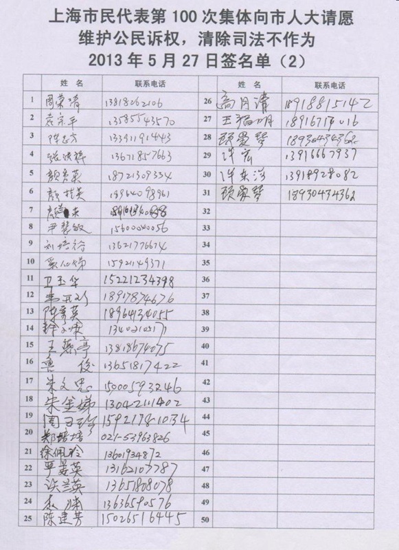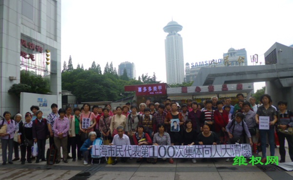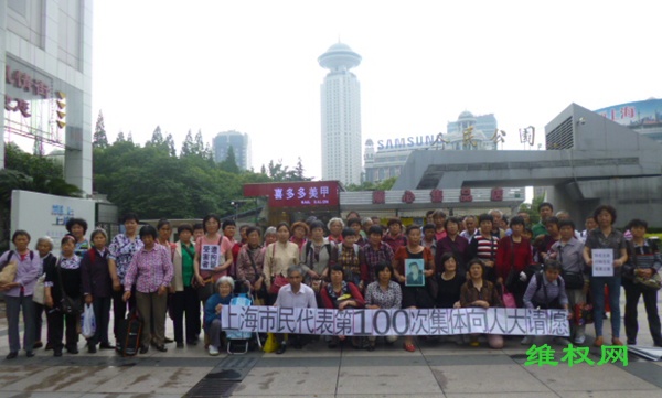 (维权网信息员孙小芸报道)5月27日星期一下午2时,上海81名市民代表参与 “我要立案——维护公民诉权”行动。为上海1060户被上海三级法院剥夺诉权的家庭第100次向市人大请愿,强烈要求市人大履行监督法院的职责。上海三级法院司法不作为,长期以来侵犯公民诉权,对上海市民提起行政诉讼的案子既不立案也不裁定。因此,市民代表第100次要求市人大监督法院对当事人的案件依法给予立案或者裁定。彻底清除上海市行政管辖区内的一切司法不作为、乱作为的恶习和腐败行为,维护公民的合法权利。