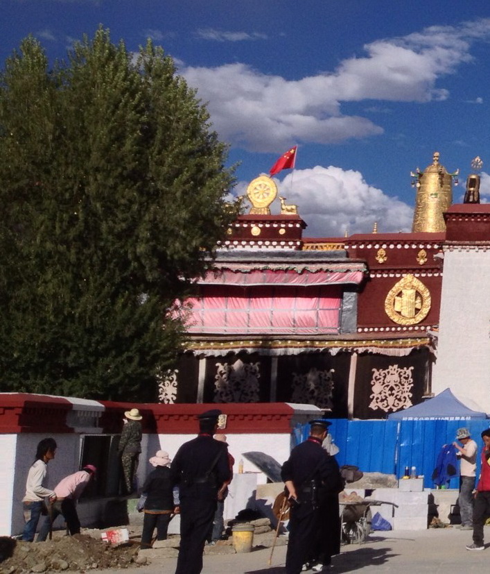 这张五星红旗插上大昭寺的照片是最新拍摄的,可以更加清楚地看到大昭寺那高高的、金色的祥麟法轮的一侧飘扬着的五星红旗。紧挨着红旗的,是一排人头幢幢出现在大昭寺顶上,不知道是游客还是便衣。大昭寺跟前的蓝色凉棚上写着“拉萨市公安局110便民警务站”,早已是此地再常见不过的一景。曾燃着千盏万盏酥油供灯的灯房,仍在原址,正在粉刷,面积似乎是有所扩容。