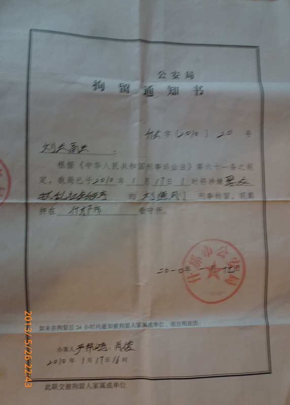 (维权网信息员李娜报道)四川省德阳市什邡市方亭街道外北村村民刘德刚向本网信息员控诉:2010年1月17日,他和另外4人因和一千多户村民一起,抗击什邡政府非法征地,被什邡公安局以“聚众扰乱社会秩序”刑事拘留,他本人5天后即1月22日被什邡公安局决定取保候审,其他人也在刑事拘留期限届满以前全部被采取了“取保候审”的强制措施。