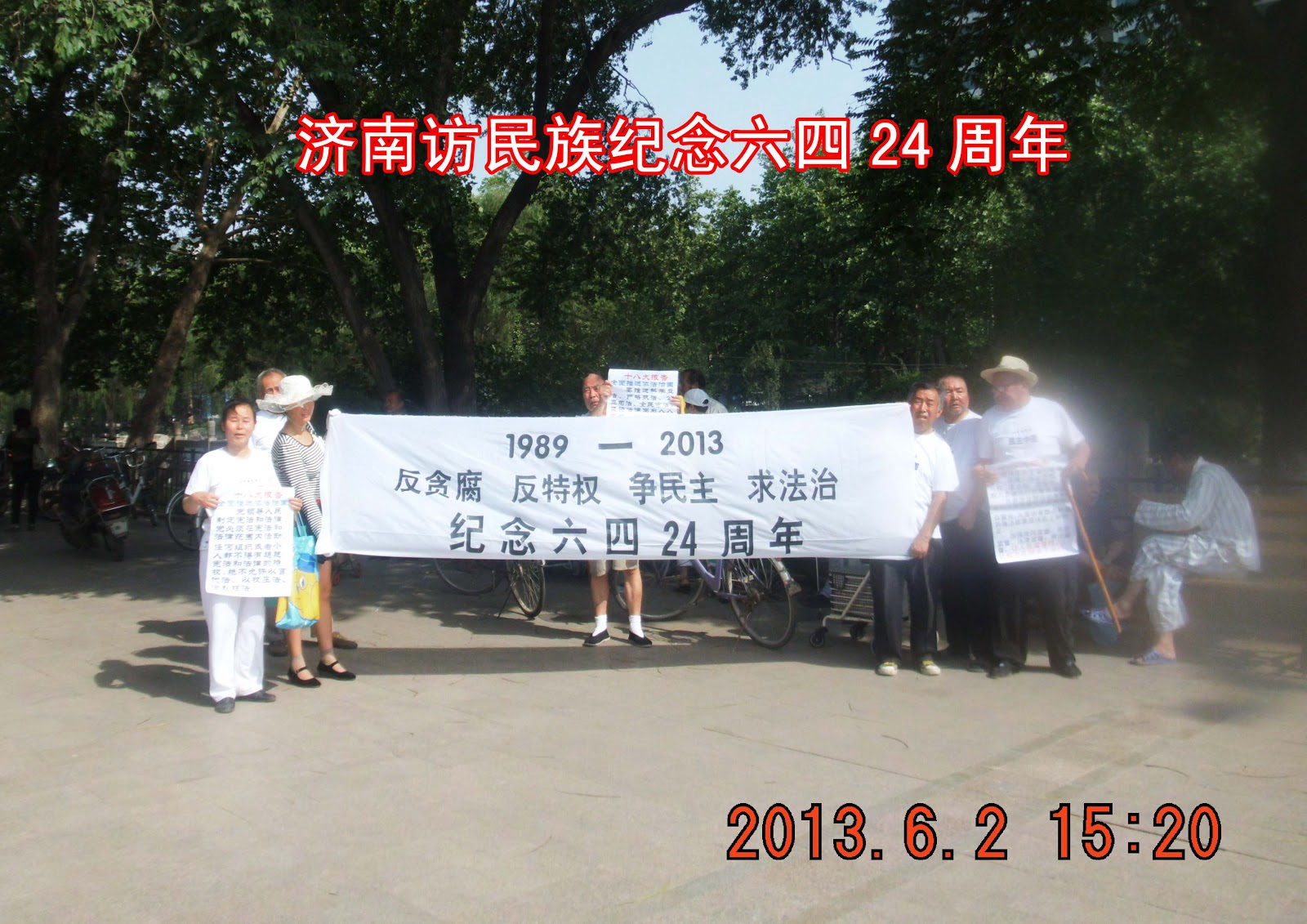 济南市天桥区成丰桥路东北侧有个游乐场,每个星期天有济南市访民族的人员来这里或交流或闲谈。2013年6月2日是星期天,不少访民来到这里。后天就是六四纪念日,有人备好了纪念六四条幅。下午3点多张金凤、刘桂琴、韩祝、宋玉春等多名访民拉起大型条幅:“1989—2013反贪腐 反特权 争民主 求法治 纪念六四24周年”表达纪念六四英烈的心声。他们无惧打压,多位访民身穿“民主中国”白色衬衫,衬衫的前胸和后背印有:“心中的向往 民主中国。”的字样。在访民中显得格外醒目,引发大家谈论六四话题。