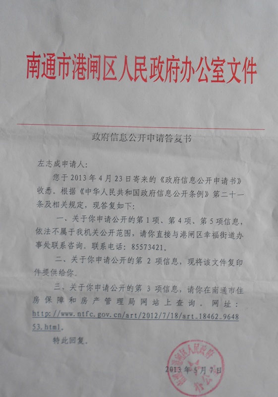 对于以上政府信息,左志成特别要求港闸区政府应当以书面形式予以答复。