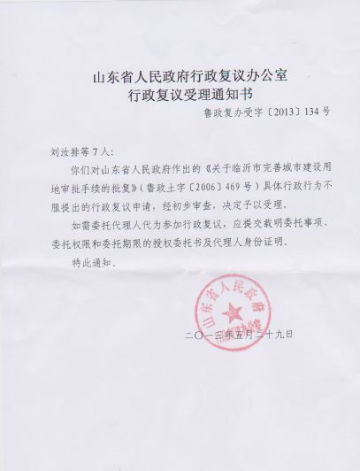 (维权网信息员张宁宁报道)5月30日,山东省政府向临沂市刘汝排等7人送达了《行政复议受理通知书》。该《通知书》称:“你们对山东省人民政府作出的《关于临沂市完善城市建设用地审批手续的批复》(鲁政土字【2006】469号)具体行政行为不服的行政复议申请,经初步审查,决定予以受理。”