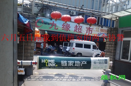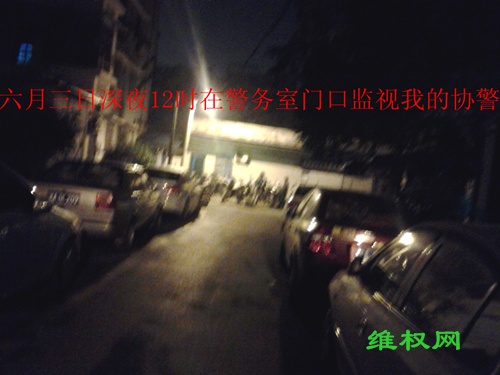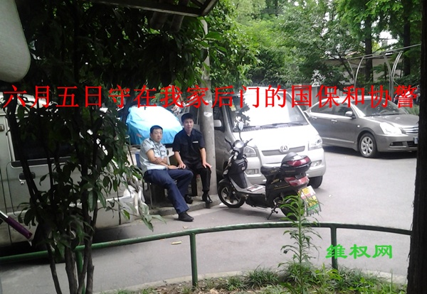 到家后,我立即被协警前门后门各两个看起来。不久我妻子打电话叫我去值班室。原来, 六月四日 我“失踪”后,派出所当晚就重建了夜间巡逻队,巡逻队把我妻子他们值班的地方占去了。我妻子他们值班的地方只有两间一共不到 五平方米 的棚子,一间是站人的,一间是放东西的。巡逻队把放东西的那间占去了,而且还锁上了门。我妻子火了,把巡逻队的三只箱子扔出来。物业主任威胁我妻子,说要开除她,于是我妻子就去找社区书记和街道书记,叫我去代班。我去值班室时,两个协警也跟着去,坐在值班室前面看着我。