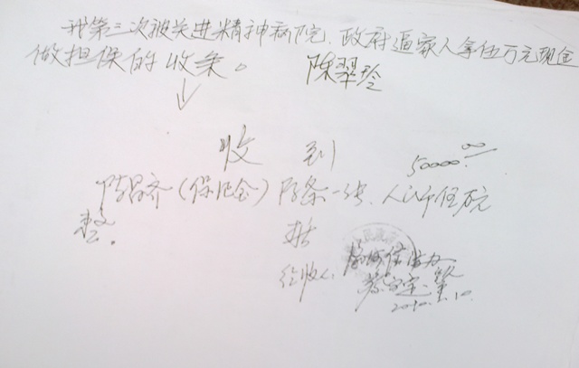 图1、陈翠玲家人被逼交五万元保证金的收据