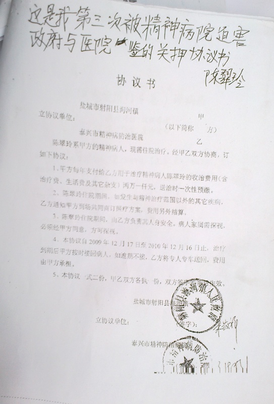 陈翠玲给本网信息员的投诉材料中,有一份她第三次被关精神病院时地方政府和精神病院签订的《协议书》。其中有这样的条款:甲方(盐城市射阳县海河镇)一次性支付用于精神病人陈翠玲的治疗费、生活费等两万一千元(如发生其他费用另外结算)。本协议自2009年12月17日 至2010年12月16日 止,到期后甲方按时接回病人……